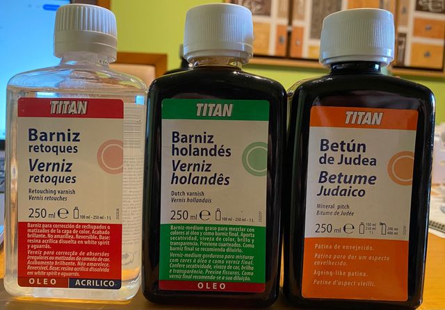 Dettagli del prodottoSet di tre vernici della marca Titan. - Vernice Ritocchi (250 ml): Finitura brillante, non ingiallisce, base resina acrilica. - Vernice Olandese (250 ml): Medium grasso per mescolare con colori all'olio, apporta rapida asciugatura e vivacità. - Ceralacca (250 ml): Per dare un aspetto invecchiato. La descrizione è stata tradotta automaticamente.