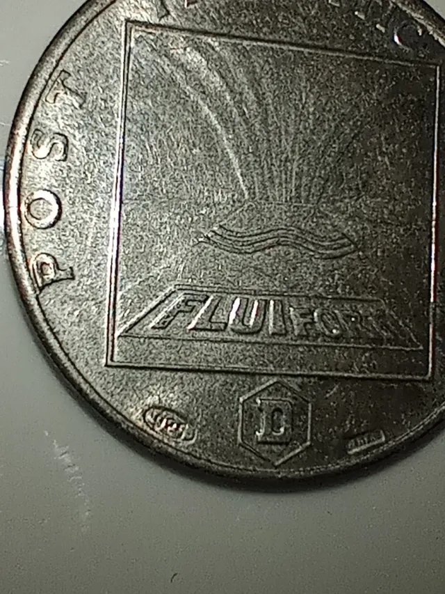 Moneta con raffigurazione di POSTE FLUIFOR. - Dettaglio di un getto d'acqua. - Simbolo J in esagono. - Marchio 1991.