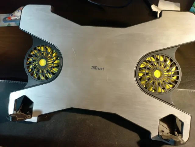 Dettagli del prodottoBase refrigerante portatile con due ventilatori per il tuo portatile. Design metallico argentato. Due ventilatori con pale gialle. Supporto regolabile per il portatile. Il supporto sinistro è fisso. La descrizione è stata tradotta automaticamente.