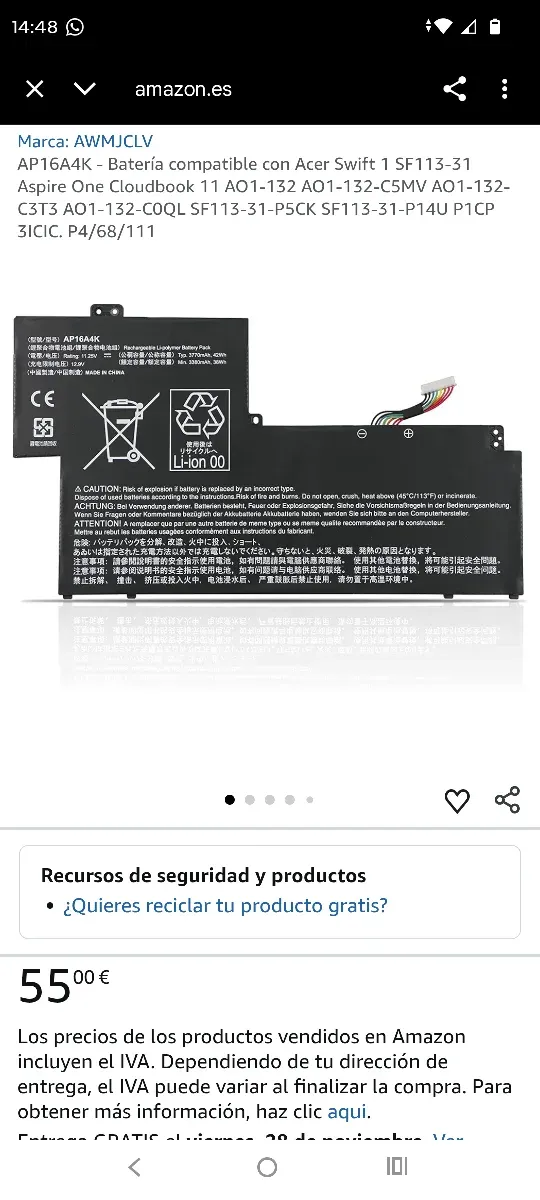 Dettagli del prodottoBatteria AP16A4K compatibile con vari modelli di Acer. - Compatibile con Acer Swift 1 SF113-31. - Compatibile con Aspire One Cloudbook 11 A01-132. - Compatibile con modelli AO1-132-C5MV, AO1-132-C3T3, AO1-132-COQL. - Compatibile con SF113-31-P5CK, SF113-31-P14U, P1CP, 3ICIC, P4/68/111. La descrizione è stata tradotta automaticamente.