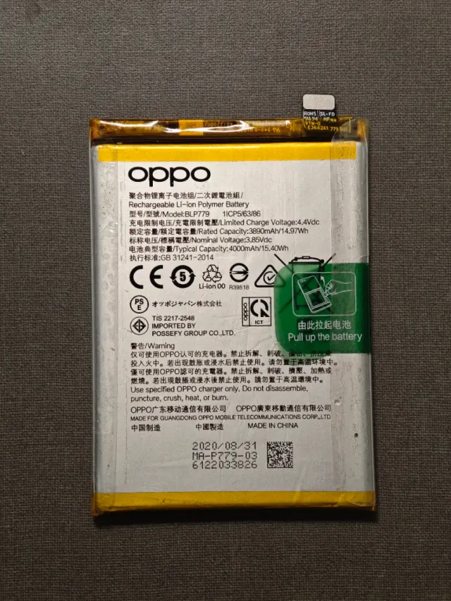 Batteria originale BLP779, proveniente da un Oppo Reno4 Z 5G CPH2065. Ha qualche segno d'uso ma funziona correttamente, viene consegnata carica al 100%. Compatibile con: - Oppo Reno4 Z 5G - Oppo A92S - Oppo A93 - Oppo F17 Pro - Oppo Reno4 Lite.