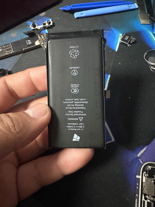 Batteria di ricambio per iPhone 13 mini. Capacità: 2406mAh. Voltaggio: 3.88V. Energia: 9.34Wh. 87% di vita.