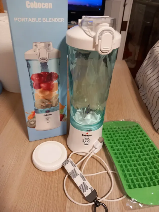 Dettagli del prodottoFrullatore portatile Cobocen, ideale per preparare frullati e frullati in viaggio. Accessori inclusi.