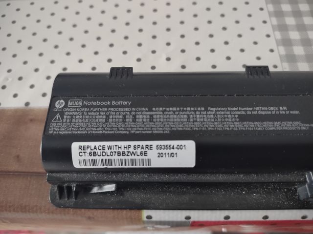 Batteria per notebook HP in buone condizioni. Per notebook hp Pavillion.usata poco - Modello: 593554-001 - Codice CT: 6BUDL07BBZWL6E - Prodotta nel 2011
