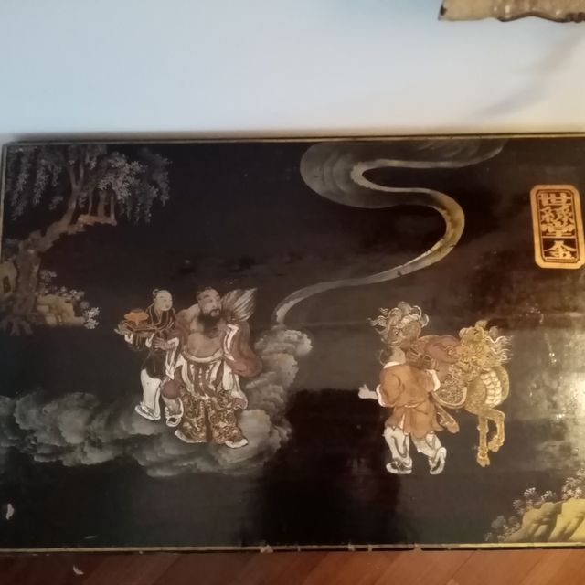Dettagli del prodottoBaule cinese antico in legno e lacca nera con decori in oro e madreperla. Chiusura, cerniere e manici in ottone. All'interno del coperchio pergamena in carta di riso con ideogrammi. Misure 65x40 altezza 35. Realizzato in legno di canfora.