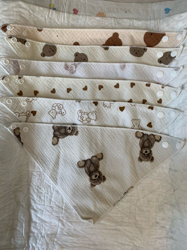 Dettagli del prodottoSet di 6 bavaglini per neonato, morbidi e teneri. Perfetti per proteggere i vestiti del tuo bambino durante i pasti. - Design con orsetti e cuoricini. - Chiusura con bottoni automatici. - Tessuto delicato sulla pelle. - Ottime condizioni.