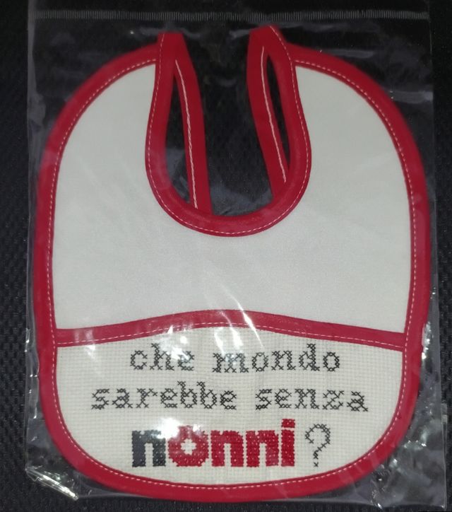 Bavaglino con frase ricamata Che mondo sarebbe senza nonni?. - Bordo rosso. - Tessuto bianco. - Ricamo a punto croce.