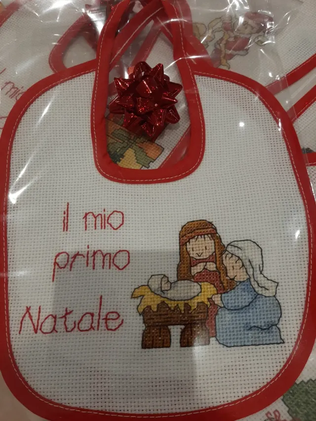 Bavaglino IL MIO PRIMO NATALE Ricamato a mano con tecnica del punto croce.