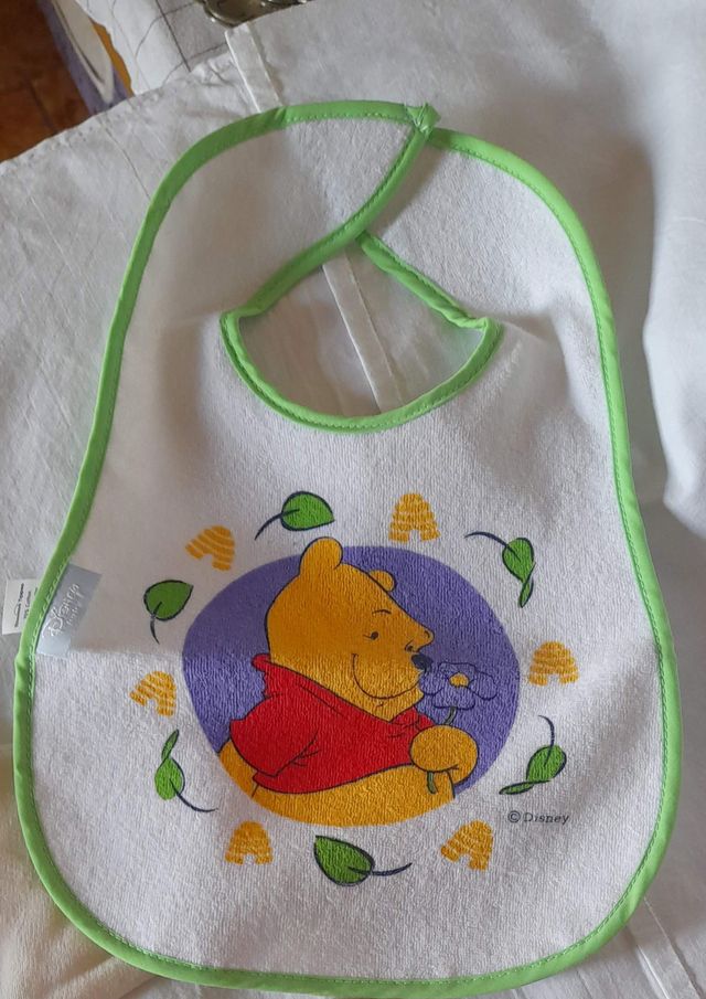 Dettagli del prodottoBellissimo bavaglino per neonati, con stampa Winnie the Pooh. - Perfetto per proteggere i vestiti durante i pasti. -Morbido e assorbente. -Con bordo verde. -Il bavaglino è in ottime condizioni.