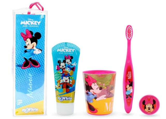 Divertente beauty case con design Minnie Mouse: completo di articoli essenziali per la cura orale tra cui uno spazzolino da denti, un dentifricio e un bicchiere multiuso, fornendo soluzioni igieniche a tutto tondo.