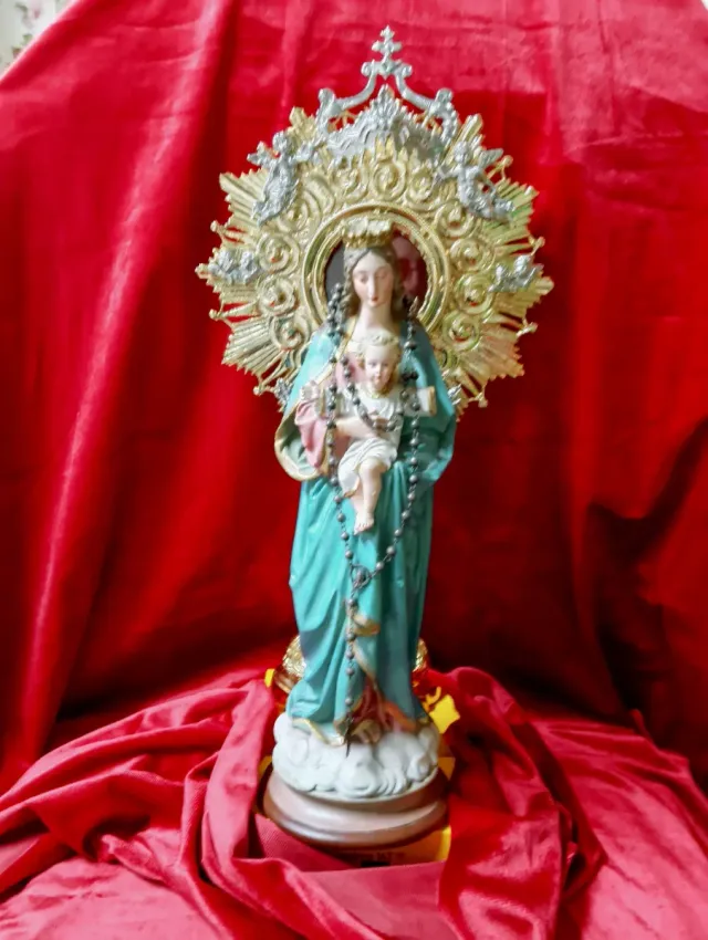 Dettagli del prodottoBellissima statua di Madonna con Bambino, di origine francese e dal fascino antico. La statua è finemente decorata con una corona dorata e un rosario.