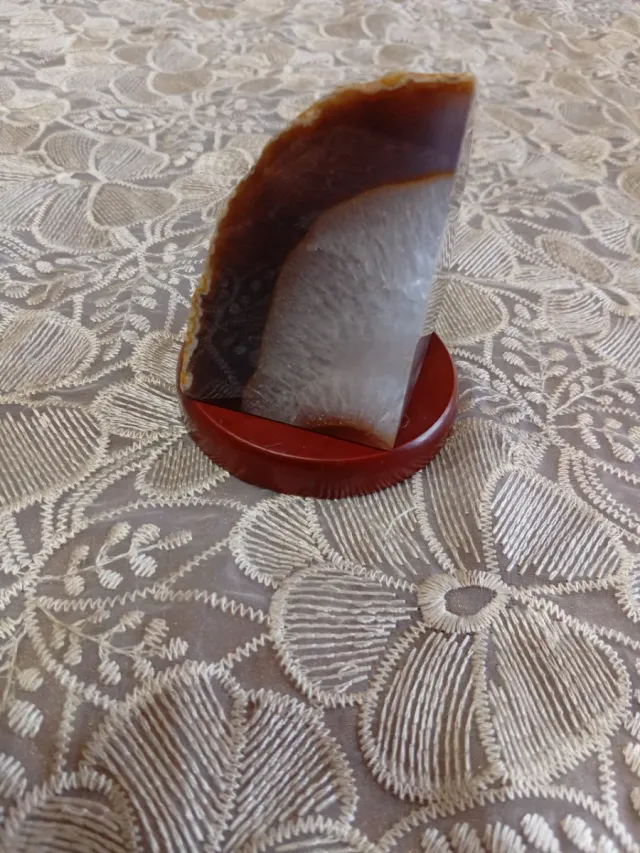 Splendida pietra di agata naturale con sfumature di colore uniche. - Cristalli interni luminosi. - Bordi naturali e grezzi. - Supporto in legno incluso.