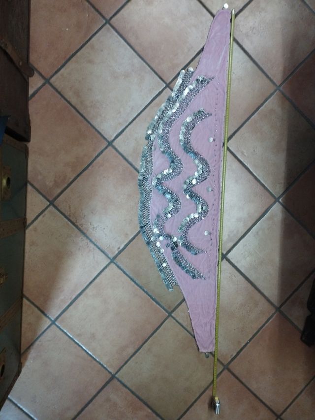 Dettagli del prodottoFusciacca e corpetto per danza orientale, in morbido velluto rosa , impreziosita da un ricamo ondulante di perline e monete argentate, misura in lunghezza 143 cm la cintura e 140 cm il corpetto