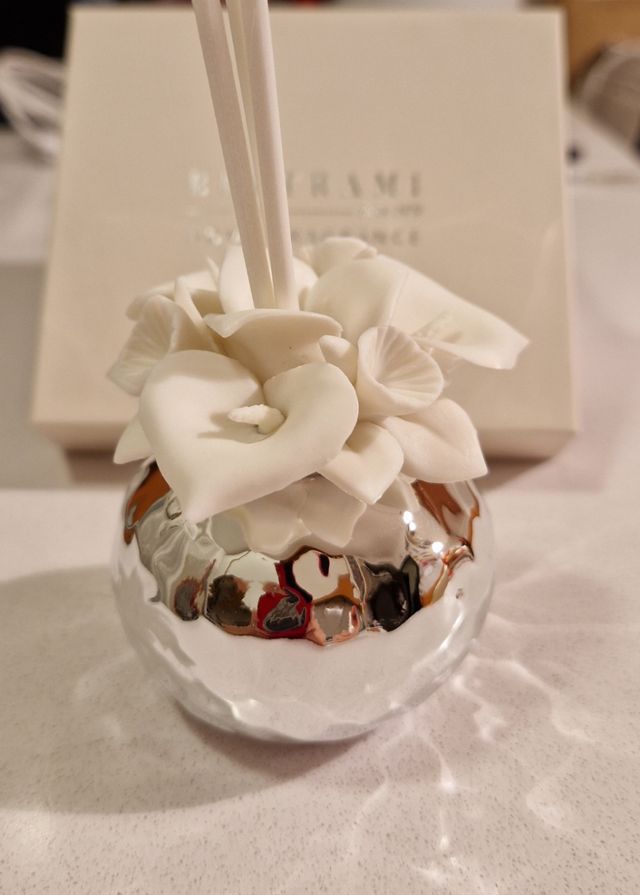 home fragrance nuovo confezione integra con certificato di garanzia porcellana bianca disegno calle base silver e argentato molto brillante