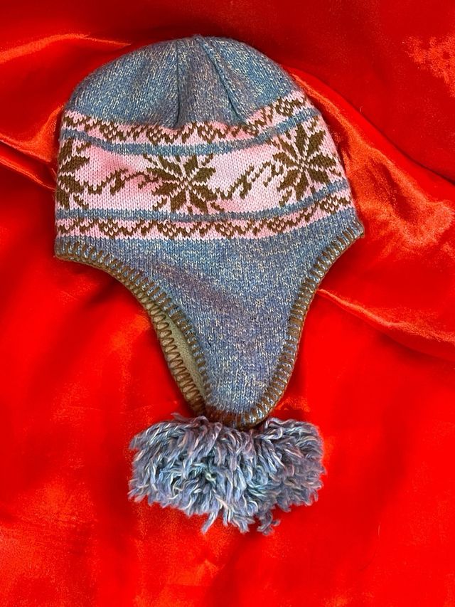 berretto in lana blu e rosa.