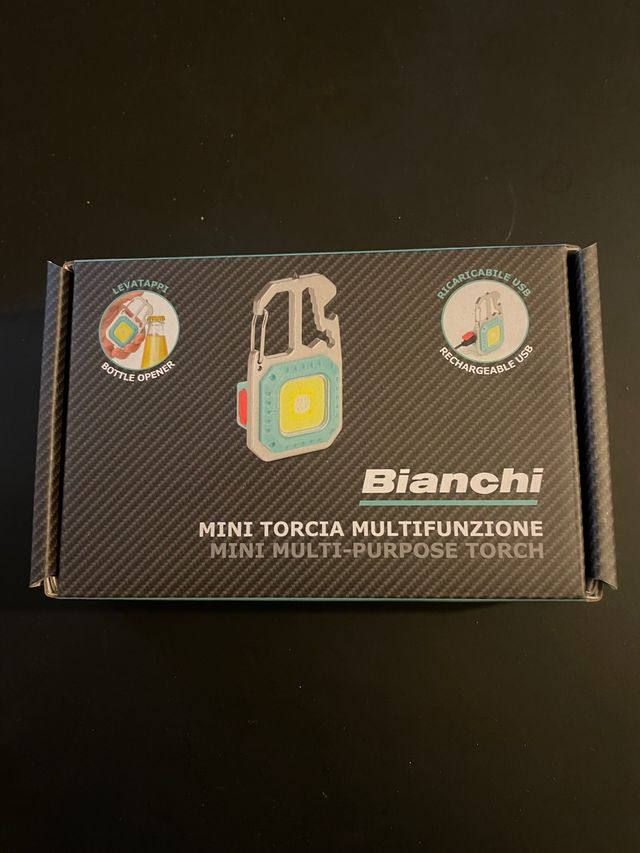 Mini torcia multifunzione Bianchi, ideale per diverse attività. - Apribottiglie integrato. - Ricaricabile tramite USB.