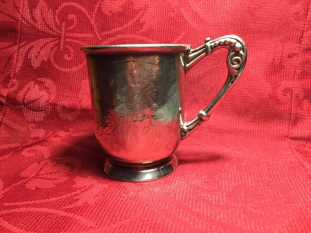 Dettagli del prodottoBicchiere degli argentieri Rogers & Brothers. Vedete punzone. Sui lati lavorazione che illustra rami di quercia, fiori e un uccello. Dalle foto non si vede bene causa i riflessi. I disegni, in rilievo al tatto, risultano consumati dalle ripetute pulizie. Altezza: 8,5 cm. Larghezza con manico: 10 cm. Peso: 140 gr.