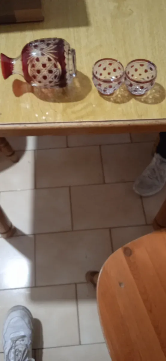 Set di bicchierini in vetro con decorazioni. - Vetro trasparente con decorazioni rosse. - Design elegante e raffinato.