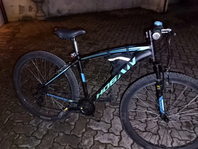 Dettagli del prodottoBicicletta da montagna HOGAN, telaio nero con dettagli azzurri e bianchi.
