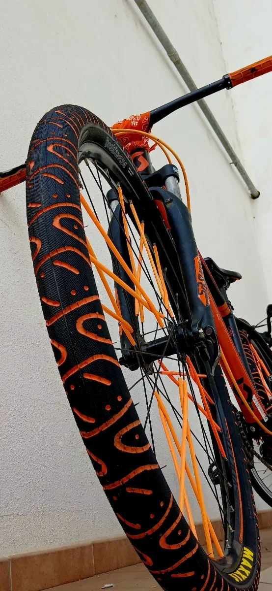 Bicicletta da wheelie Scott con un vivace design arancione. - Cerchi neri con decorazioni arancioni. - Raggi arancioni. - Manubrio arancione.
