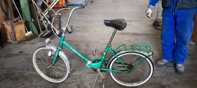 Dettagli del prodottoBicicleta BH di colore verde, un modello vintage ancora in uso. - Telaio verde. - Ruote con cerchi bianchi. - Sella nera. - Portapacchi posteriore. La descrizione è stata tradotta automaticamente.