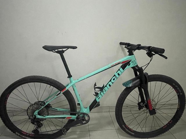 Dettagli del prodottoBicicletta da montagna Bianchi Nitron 9.4 in colore verde menta. Telaio in alluminio. Ruote da 29 pollici. Freni a disco. Cambio Shimano. La descrizione è stata tradotta automaticamente.