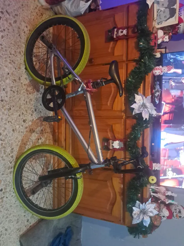 Dettagli del prodottoBicicletta BMX color argento con dettagli accattivanti. - Ruote gialle brillanti. - Sella nera. - Pedali neri. La descrizione è stata tradotta automaticamente.