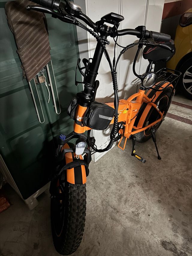 Dettagli del prodottoBicicletta elettrica di colore arancione, ideale per spostamenti urbani o passeggiate. - Design pieghevole per un facile stoccaggio. - Ruote larghe per una maggiore stabilità. - Include cestino posteriore e borsa anteriore. La descrizione è stata tradotta automaticamente.