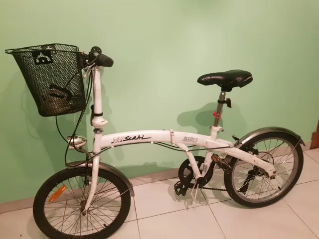 Dettagli del prodottoBicicletta pieghevole di colore bianco, modello WAY SCAL 250. È compatta e facile da trasportare. - Cestino anteriore. - Parafango posteriore. La descrizione è stata tradotta automaticamente.