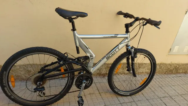 Dettagli del prodottoBicicletta da montagna Scott con sospensione anteriore e posteriore. Equipaggiata con cambio a 7 pignoni e 3 piastre, componenti di prima qualità della prestigiosa marca svizzera. - Telaio in alluminio argentato. - Ruote da 26 pollici. - Freni a disco. - Cambio Shimano. La descrizione è stata tradotta automaticamente.