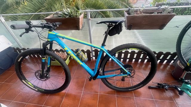 Dettagli del prodottoBicicletta da montagna Trek Superfly 9.8 in colore blu e verde. Telaio in alluminio. Ruote da 29 pollici. Freni a disco. Sospensione anteriore. La descrizione è stata tradotta automaticamente.