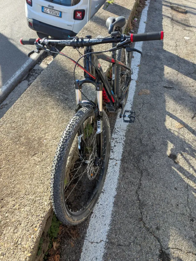 Bicicletta elettrica da mountain bike con telaio nero e dettagli rossi. - Manopole rosse. - Sospensioni anteriori. - Freni a disco.