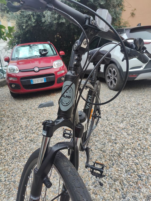 Bicicletta Olmo modello Nava uomo con telaio trekking alluminio, forcella ammortizzata RST, cambio Shimano Acera 3×8, freni a disco idraulici, ruote alluminio doppia camera, copertoni 700X40, colore grigio/verde o nero