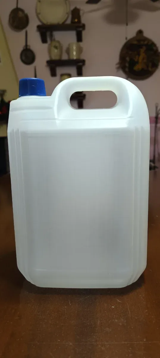 Bidone in plastica bianca da 5 litri, ideale per conservare liquidi. - Manico integrato per un facile trasporto. - Tappo blu di chiusura.