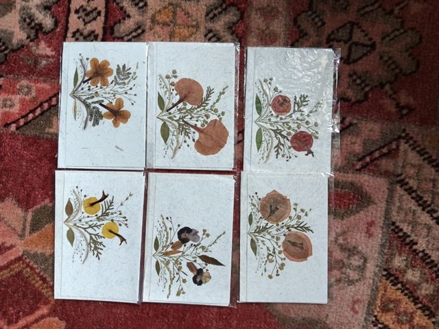 6 biglietti augurali creati con veri fiori e foglie. Anche la carta è prodotta artigianalmente con materiali naturali.