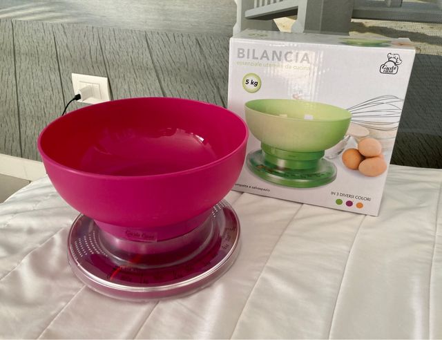 Dettagli del prodottoUtilissima bilancia da cucina con piatto in plastica rigido, peso max 5 kg, colore viola chiaro, in ottime condizioni e funzionante. Misure del prodotto