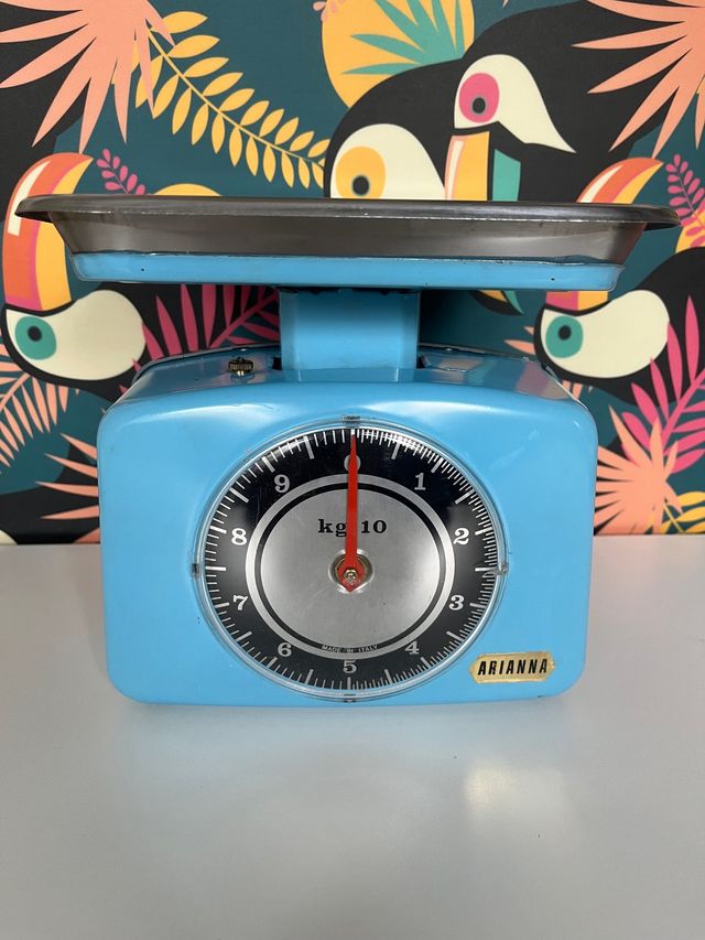 Bilancia Deka modello Arianna di colore celeste (molto Raro da reperire). Produzione italiana, funzionante, qualche segno del tempo ma nel complesso in ottimo stato. Il vassoio è praticamente nuovo. Nessun segno di ruggine. Il modello era diffuso negli anni '50/'60. Molto bella da tenere esposta in cucina. Per amanti del genere.