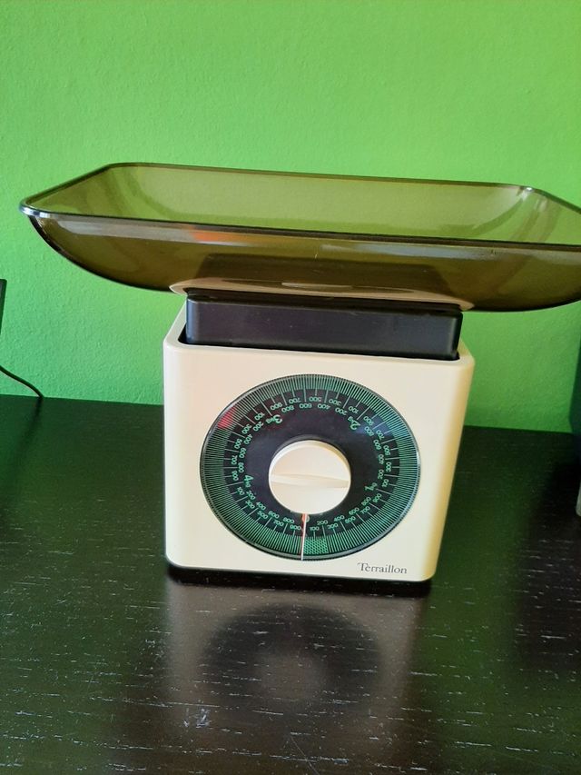 Bilancia da cucina vintage "Terraillon" anni '70, portata 5 kg, altezza 22 cm ca., color panna con vassoio marrone (dimensioni 28x18 cm ca.)
