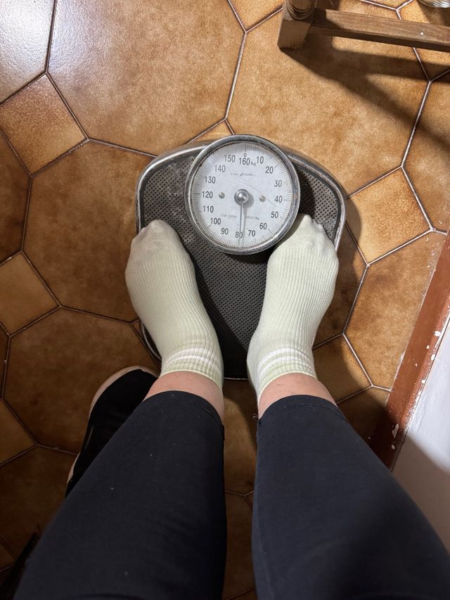 Bilancia pesapersone vintage con quadrante analogico. - Struttura in metallo. - Quadrante con numeri in nero e rosso. - Indicatore di peso mobile.