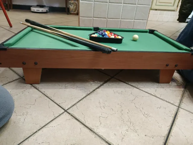 Biliardino da tavolo completo di stecche e palline. - Include stecche per il gioco. - Set di palline colorate. - La pallina numero 8 è mancante.