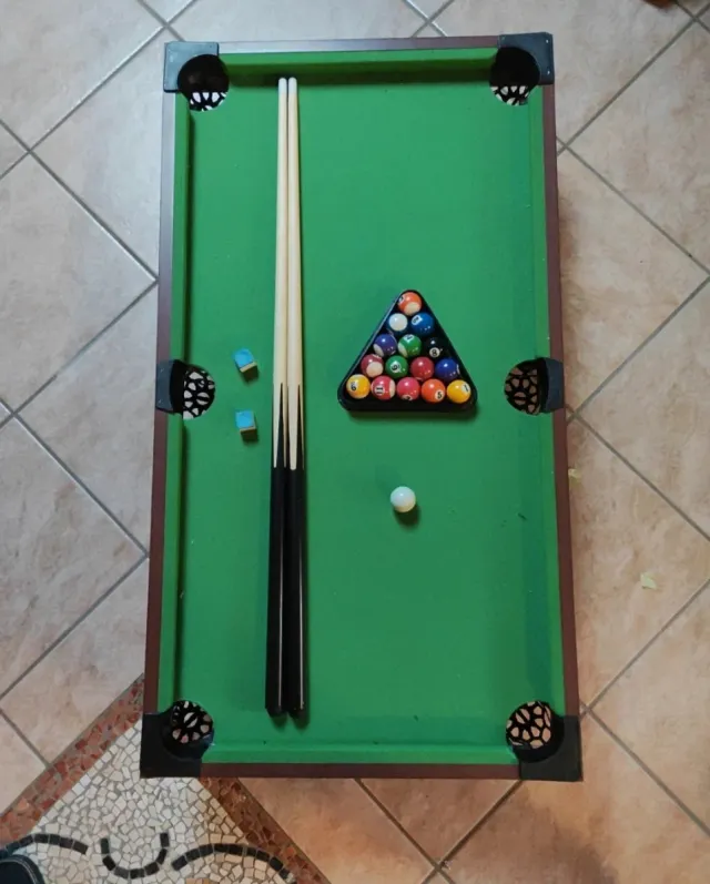 Biliardino da tavolo completo di accessori. - Biliardino con stecche. - Set di palline da biliardo. - Triangolo per la disposizione delle palline. - Cubetti di gesso.