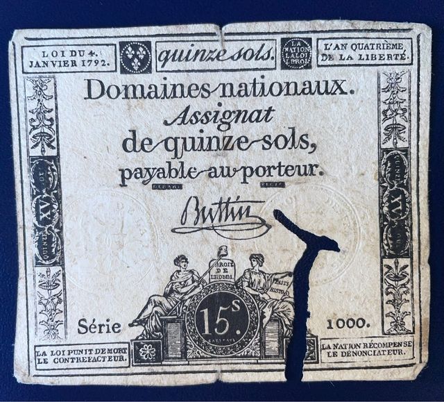 Biglietto Assignat 1792 15 sols Rivoluzione Francese