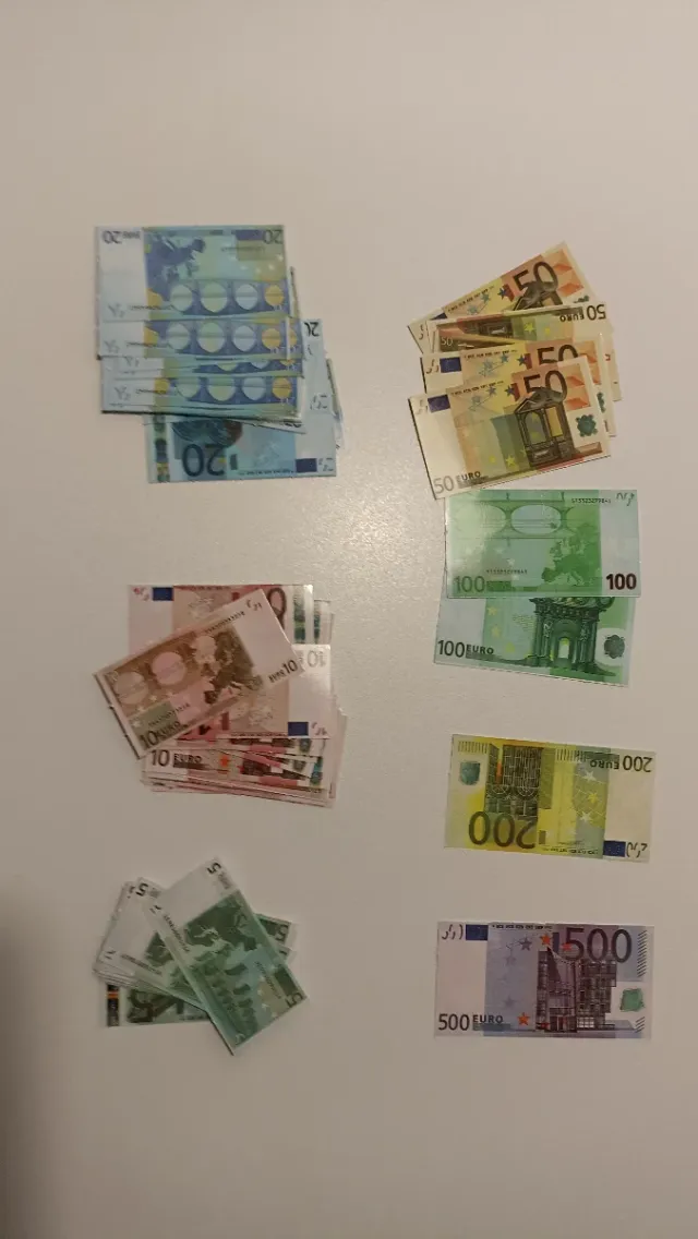 Dettagli del prodottoConfezione di piccoli biglietti plastificati per giocare. Ideale per giochi come Monopoly o casse registratrici. Editi dalla Banca di Spagna. Scala 1:2. Il biglietto da 5€ misura 3cm x 6cm e il più grande da 500€ misura 4cm x 7,8cm. Ci sono circa 59 biglietti. Ci sono diversi di ogni tipo, da 5€ a 500€. Preferibilmente spedizione tramite Inpost. La descrizione è stata tradotta automaticamente.