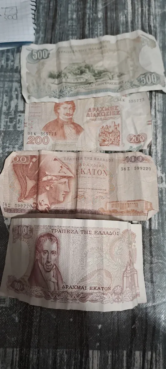Dettagli del prodottoSet di banconote greche in Dracme. Contiene una banconota da 500 Dracme, una da 200 Dracme e due da 100 Dracme. La descrizione è stata tradotta automaticamente.
