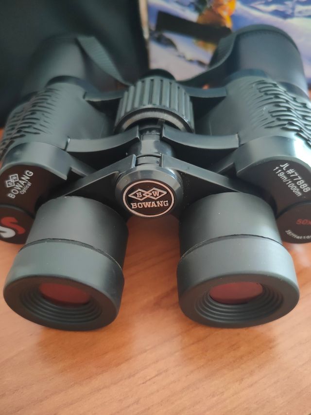 Binocolo Bowang nero con custodia in tessuto. 50x50 - 119m/1000 m. All'interno sono presenti anche il laccetto e la pezza per pulire le lenti.