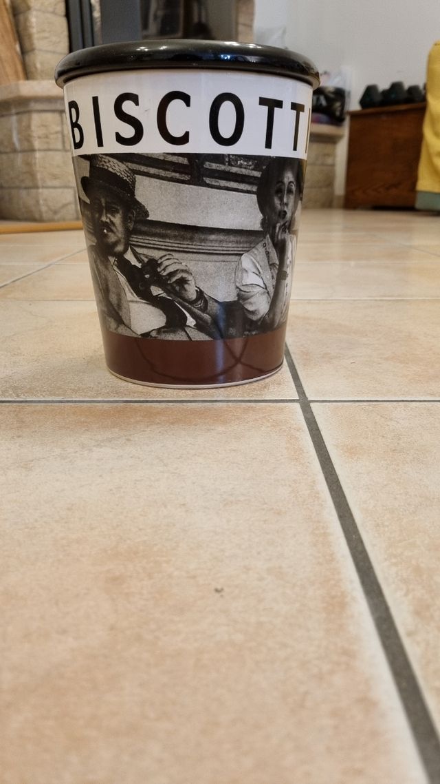 Biscottiera in ceramica, con chiusura ermetica con guarnizione e con decorazioni vintage nei toni del bianco e del marrone. Mai usata.