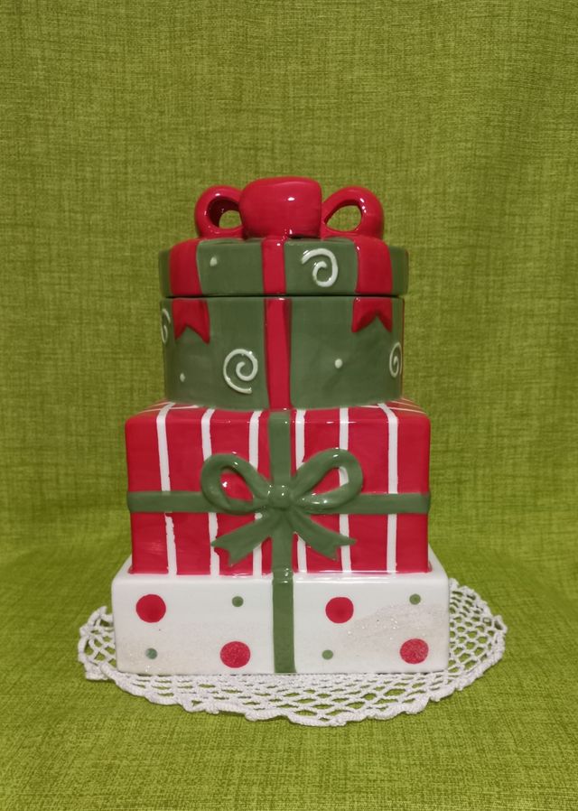 biscottiera in ceramica natalizia a forma di pacchi regalo 🎁 alto cm24 ,largo alla base cm16,5