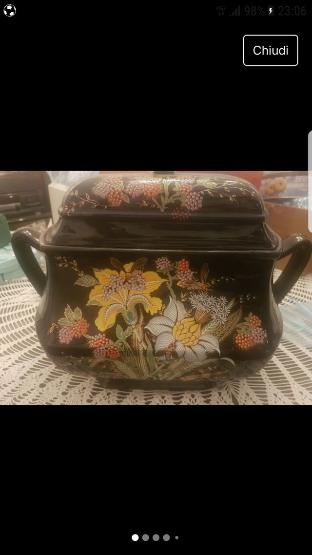 Dettagli del prodottoBiscottiera ceramica antica, leggermente intaccata nel fondo ( vedere foto ) praticamente intatta , notare l originalita e' il marchio qualita', i disegni floreali che vedete sono laminate in oro...x qualsiasi domanda potete chiedere informazioni.