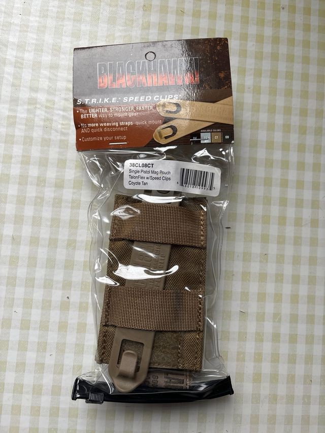 Dettagli del prodottopouch singolo caricatore per pistola colore coyote tan, compatibile con sistemi M.O.L.L.E. e blackhawk S.T.R.I.K.E. con speed clip, in confezione originale. Misure del prodotto