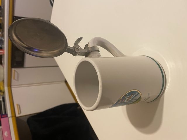 Boccale birra aying in porcellana da 0.50 cl. Anni 80. Pezzo raro, con chiusura.